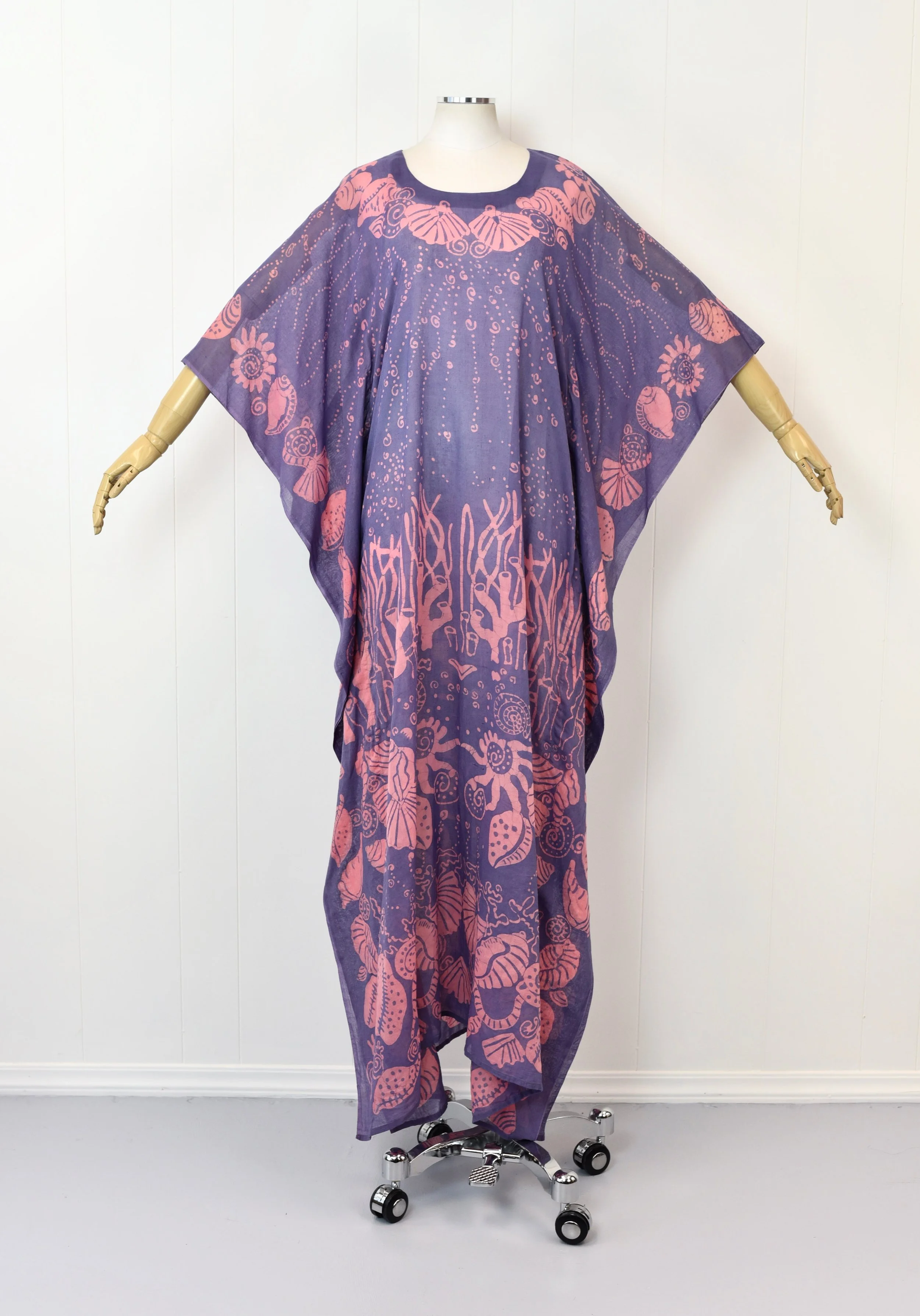 1970s Ramona Rull Batik Purple Pink Seashell Ocean Theme Novelty Print Caftan Maxi Dress